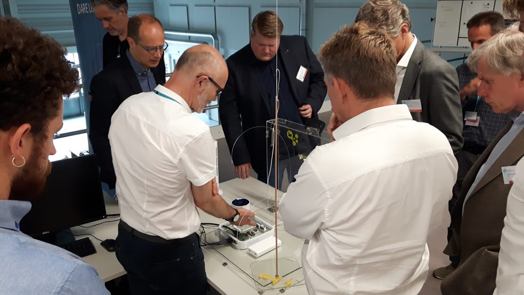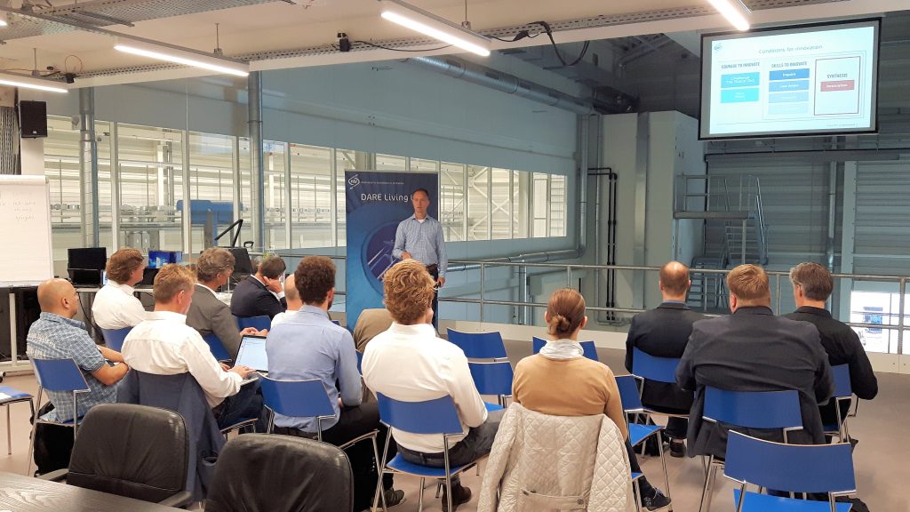 Oscar Zoeteweij is verantwoordelijk voor het DARE Living Lab. Dit Living Lab moet innovatie stimuleren en faciliteren, zegt hij. Vervolgens somt hij een aantal randvoorwaarden op die nodig zijn om de route van idee tot nieuwe dienst of product succesvol af te leggen. Je moet bijvoorbeeld de moed hebben, maar ook de vaardigheden. En je moet in staat zijn over je eigen vooroordelen en voorkennis heen te stappen. “Dat is de ellende hier; ze weten zo veel, er is zo veel kennis, dat er al snel gezegd wordt: ‘dat kan niet, want …’. In tegenstelling tot een start-up die het gewoon probeert. Daarom is het super dat jullie hier zijn, want samenwerken met andere disciplines helpt. Ook oefenen is belangrijk en dat is de lol van DARE.”