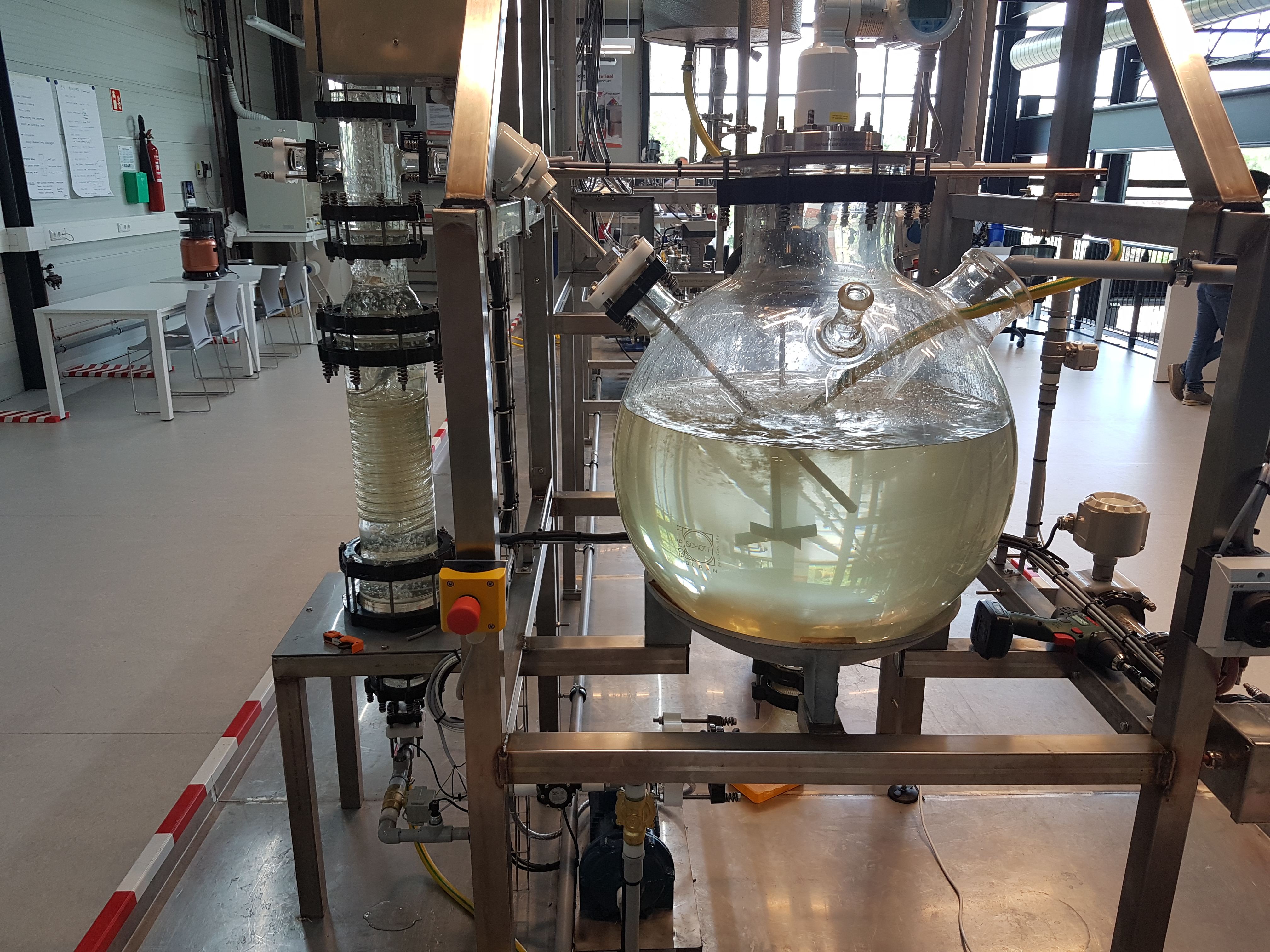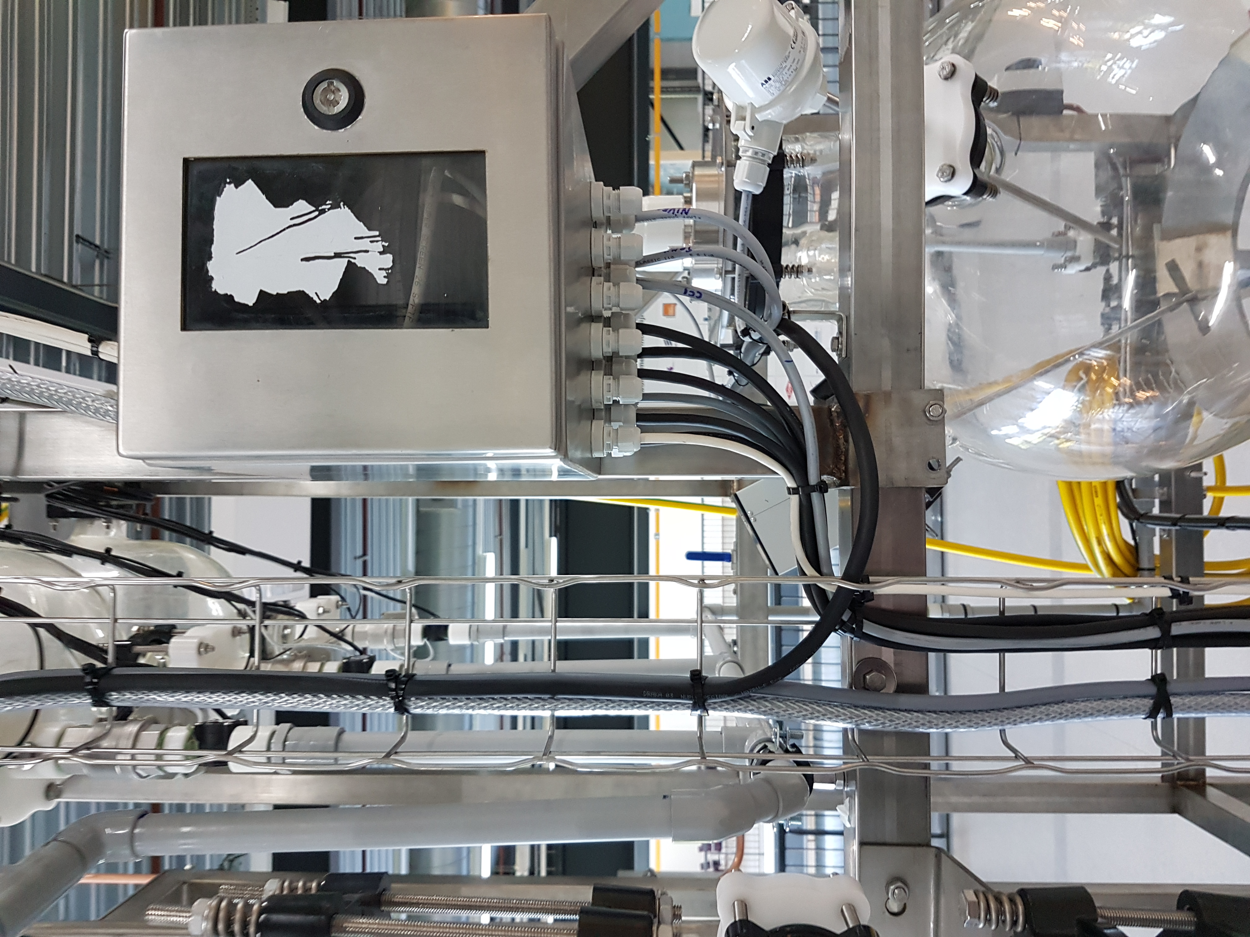 Er is van technisch glaswerk een 100 liter reactor systeem gebouwd waarin gedoseerd kan worden vanuit 3 additievaten. De exotherm wordt gesimuleerd met een warmte element van 6 kW. Koeling gebeurd door een glazen spiraal koeler.